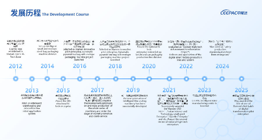 Founded in July 2012 and located in Xiamen Torch High-tech Industrial Development Zone, CEEPAC is a new-type technology enterprise specialized in industrial automation system integration that promotes Industry 4.0. It has also been recognized as a National High-tech Enterprise, a Fujian Provincial Technology-based "Little Giant" Enterprise, an Xiamen Specialized, Refined, Differential and Innovative Enterprise, a Xiamen Innovative Pilot Enterprise and a Gazelle Enterprise etc.
