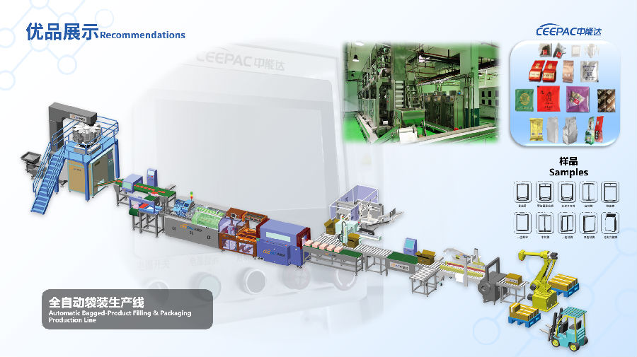 中能达的产线自动化事业部为客户提供个性化定制的罐装、袋装、盒装等系统解决方案,帮助企业解决生产难题,实现设备升级改造,提高能效。 CEEPAC's Production Line Automation Division provides customers with personalized and customized canning, bagging, boxing and other packaging formats system solutions. It helps enterprises solve production problems, realize equipment upgrading and transformation, and improve energy efficiency.